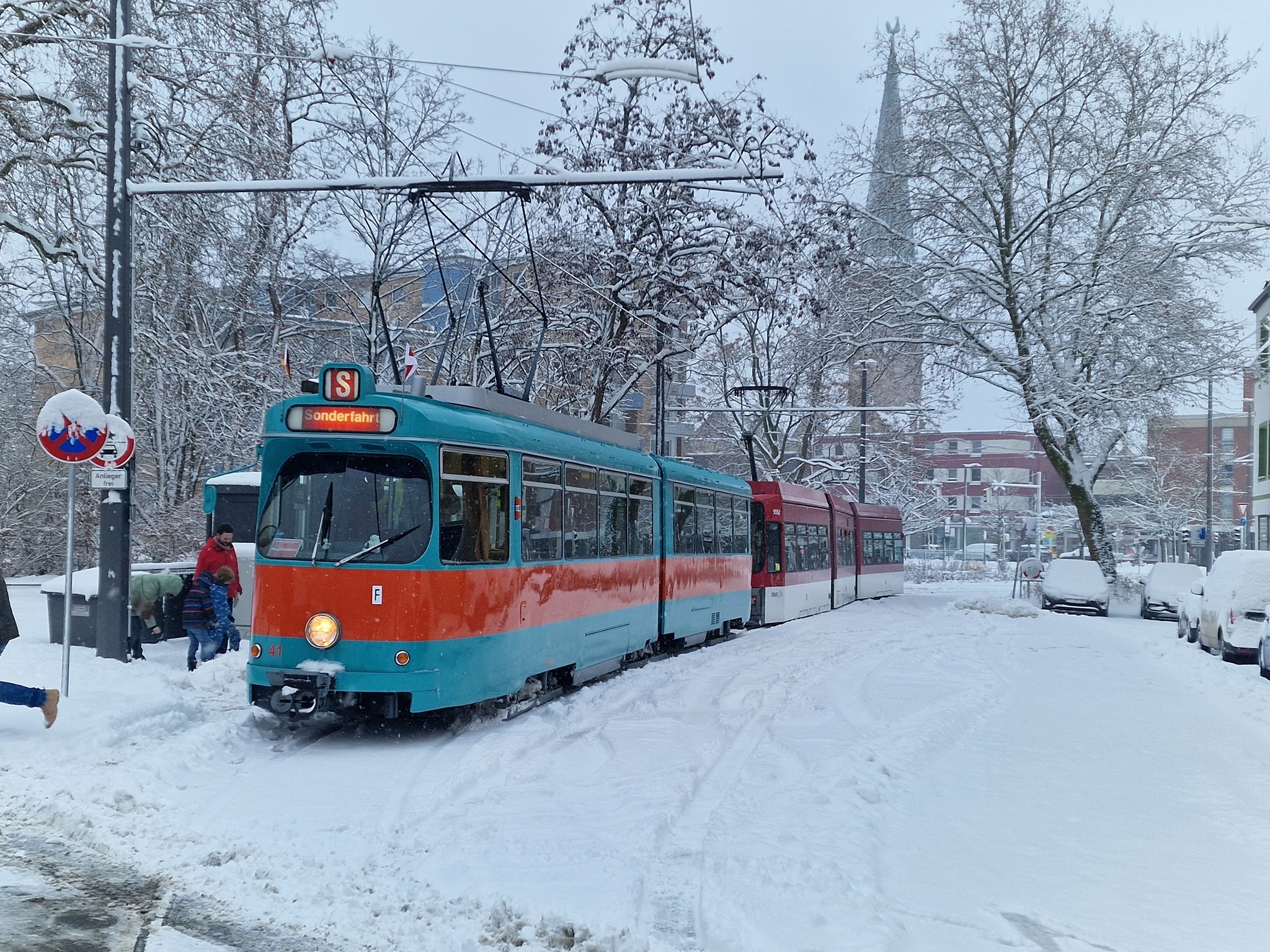 In der Nacht zum 04.01.2026 hatte es ordentlich geschneit und der Stadtbahnbetrieb war zunächst eingestellt. Die Sorge war groß, dass unsere Neujahrsfahrt nicht stattfinden kann. Doch die BSVG hat nach und nach die Strecken geräumt und wir konnten wie geplant mit 41 und 9552 starten.