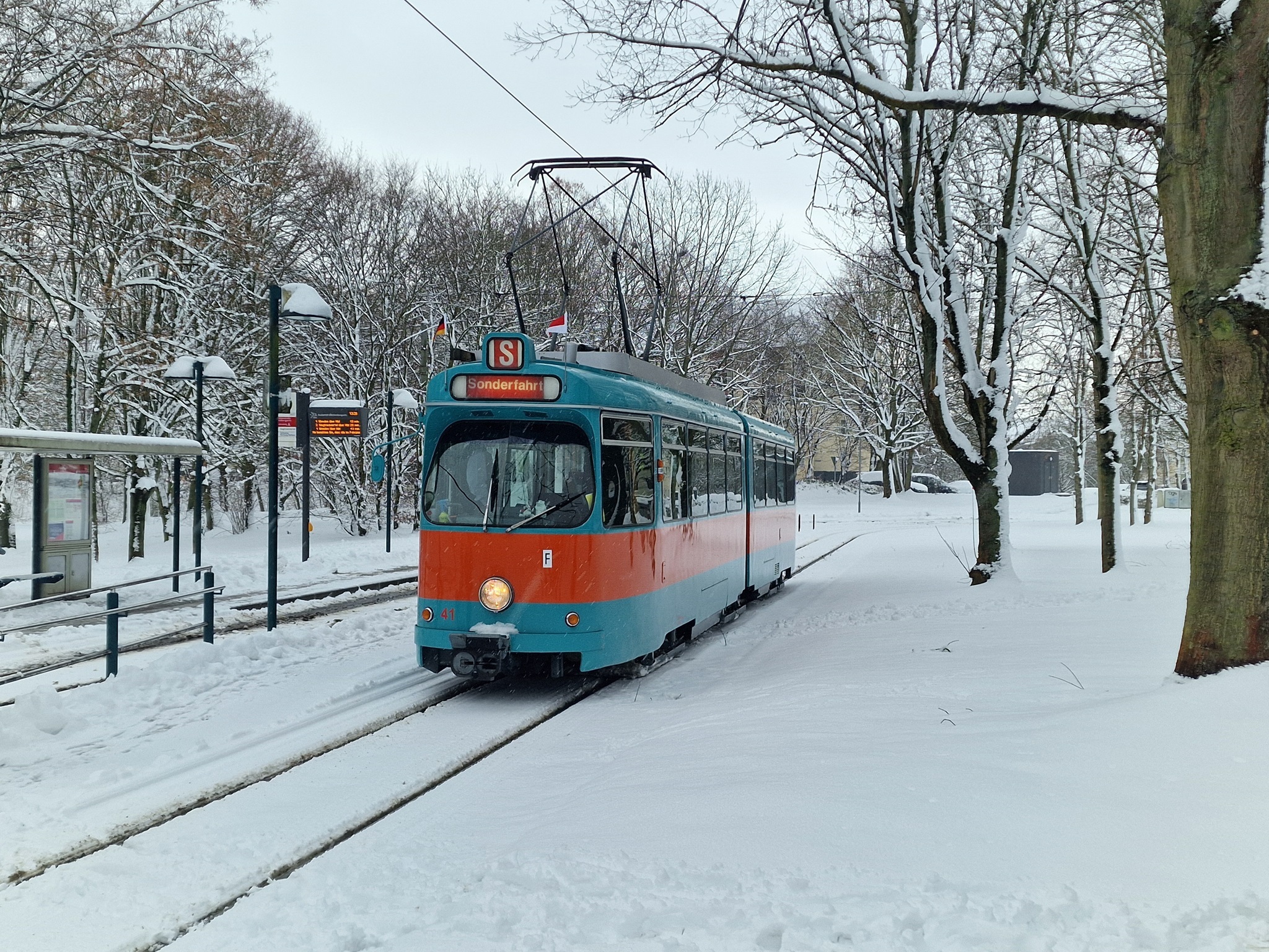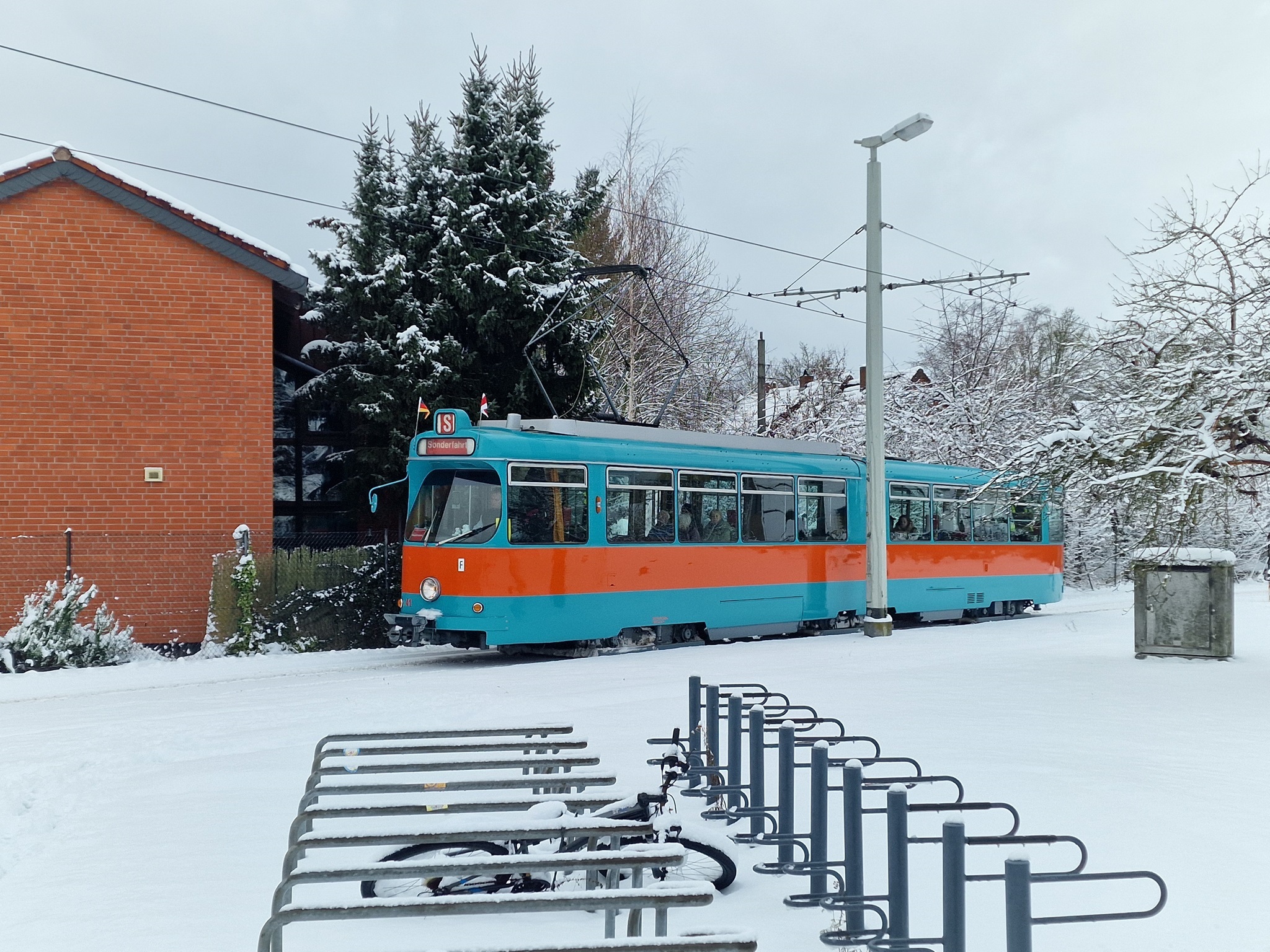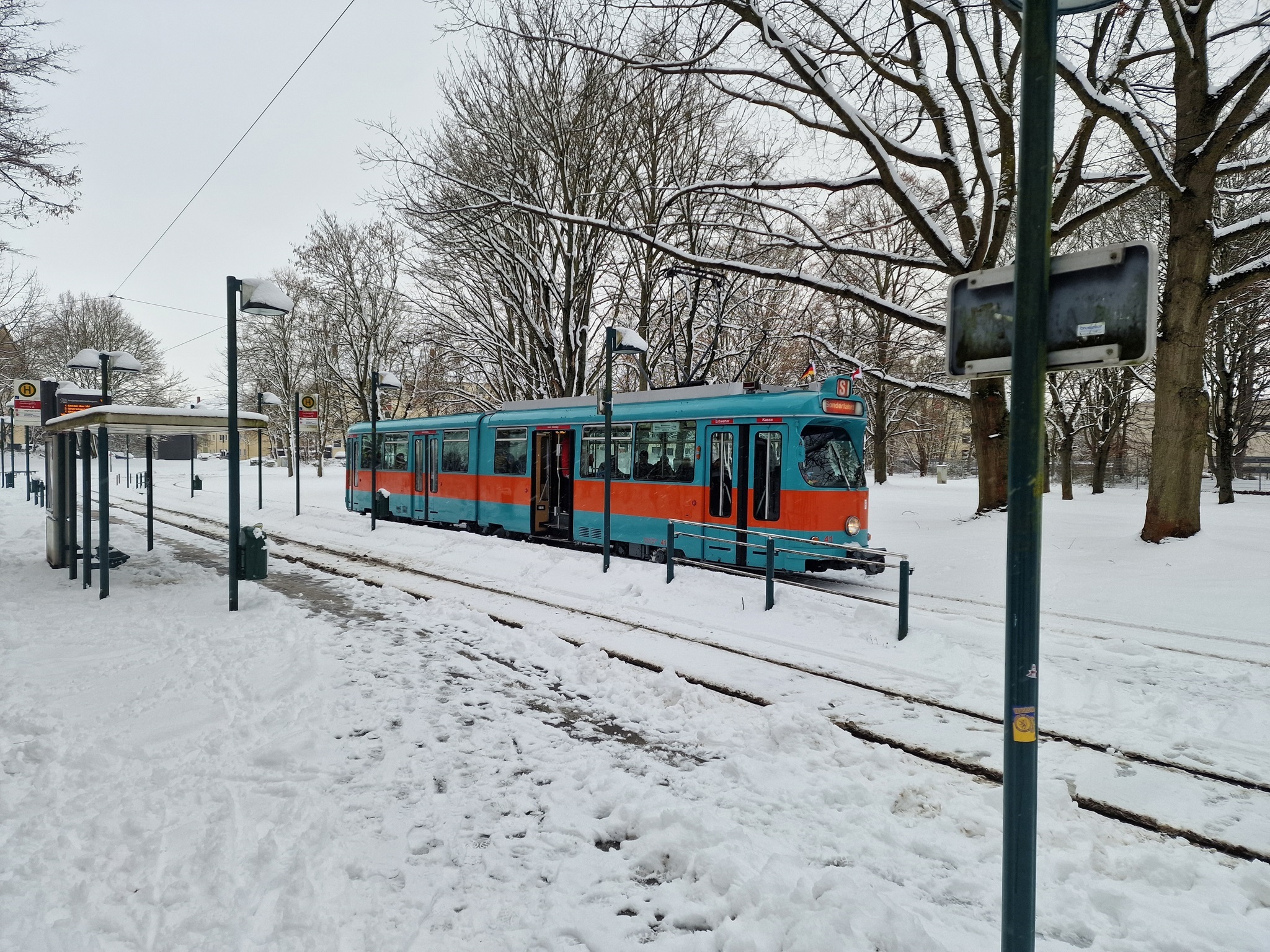 In der Nacht zum 04.01.2026 hatte es ordentlich geschneit und der Stadtbahnbetrieb war zunächst eingestellt. Die Sorge war groß, dass unsere Neujahrsfahrt nicht stattfinden kann. Doch die BSVG hat nach und nach die Strecken geräumt und wir konnten wie geplant mit 41 und 9552 starten.